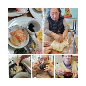 はなみの家マウントバード通信 はなみの家 明けましておめでとうございます!!! 2026年のスタートです!! 2026年がスタートしました! はなみの家でも豪華おせち料理を作り、新年をお祝いしました。 ご利用者とお汁粉とも作りました♪甘くて柔らかくて大好評でした♪ 色とりどりのお料理や昔から皆さんが楽しく、大切に過ごしたお正月をここでも 提供できたのではないかなと沢山の笑顔を見ながら感じていました。 今年も1年、ご利用者の「うれしい」「楽しい」がたくさん見られるように 活動していきますのでどうぞよろしくお願いいたします。