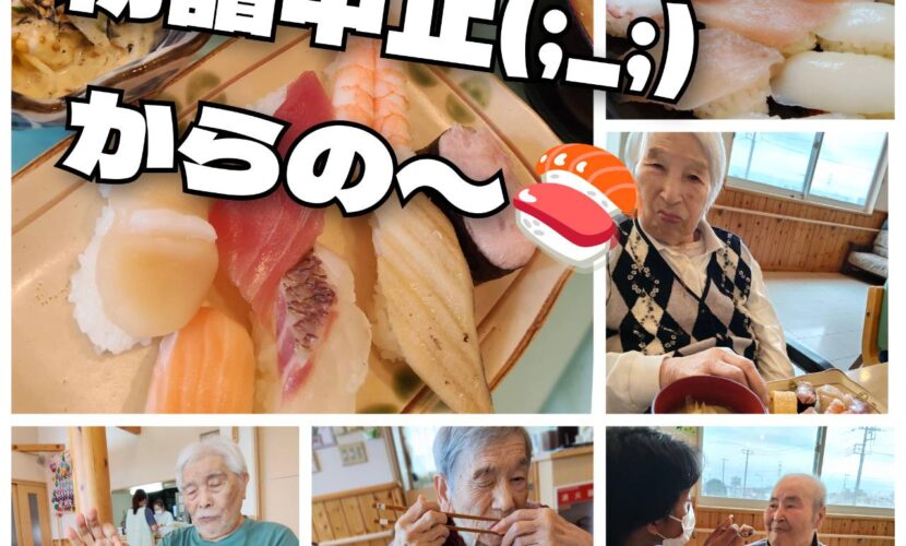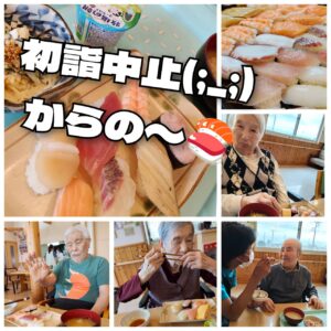 はなみの家マウントバード通信 残念ではありました・・が!! はなみの家 今年は初詣に行こうと前々から企画していました。 皆さんのリクエストで千葉神社に行って、豆大福を買って帰ろうとワクワクしていたのですが・・ 近隣でインフルエンザが流行っていると聞き、直前で断念。 でも、ホームの中でせめておいしいものを食べたいとまたまた皆さんにリクエストを聞くと 「お寿司!」と♪ やっぱりはなみの2階、不動の人気メニューはお寿司です♪ 持ち帰りメニューを頼んで、お寿司ランチを楽しみました! またリベンジでお出かけを企画します!