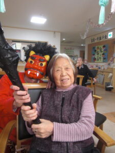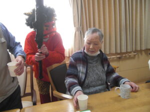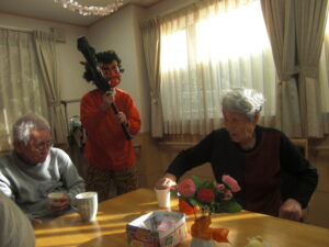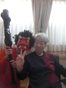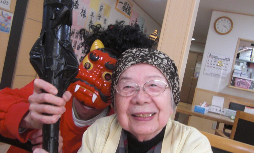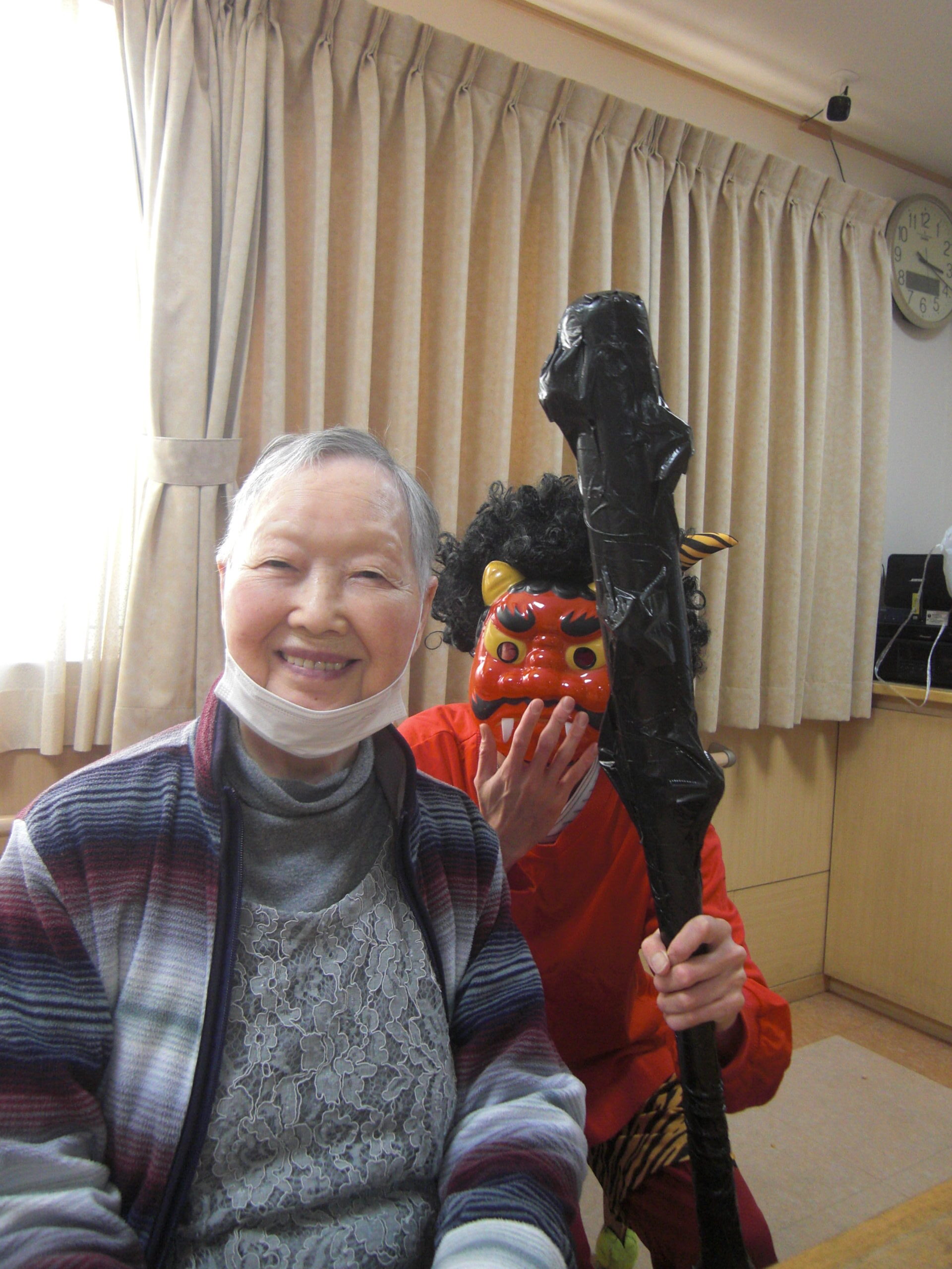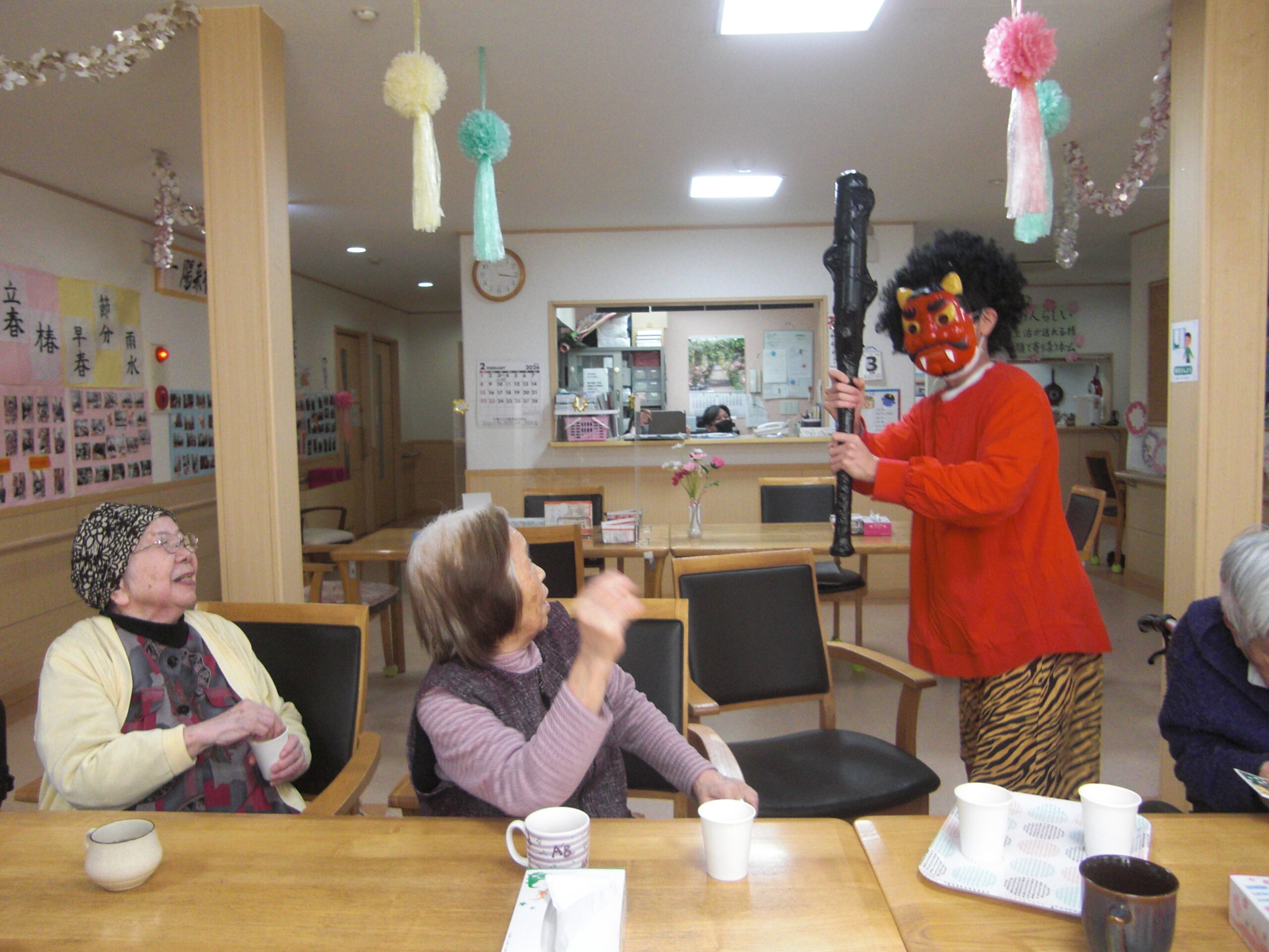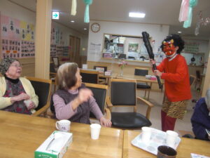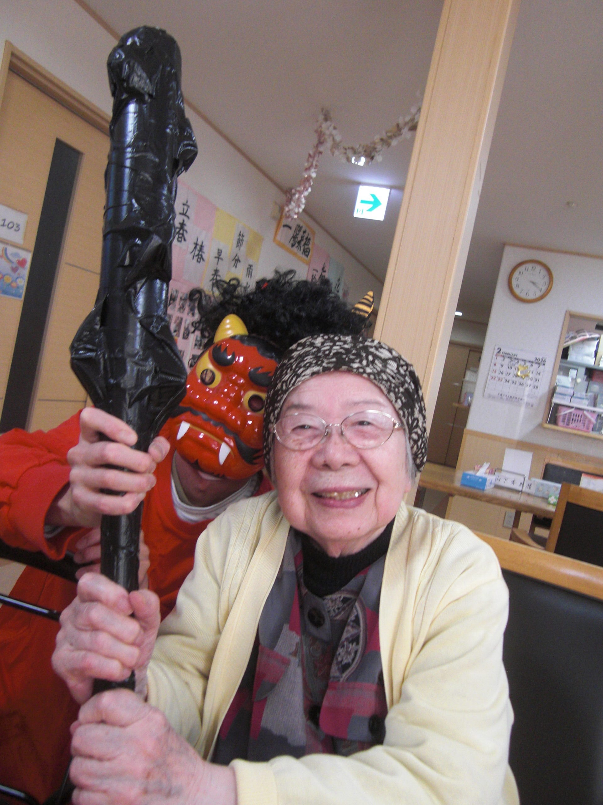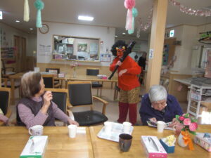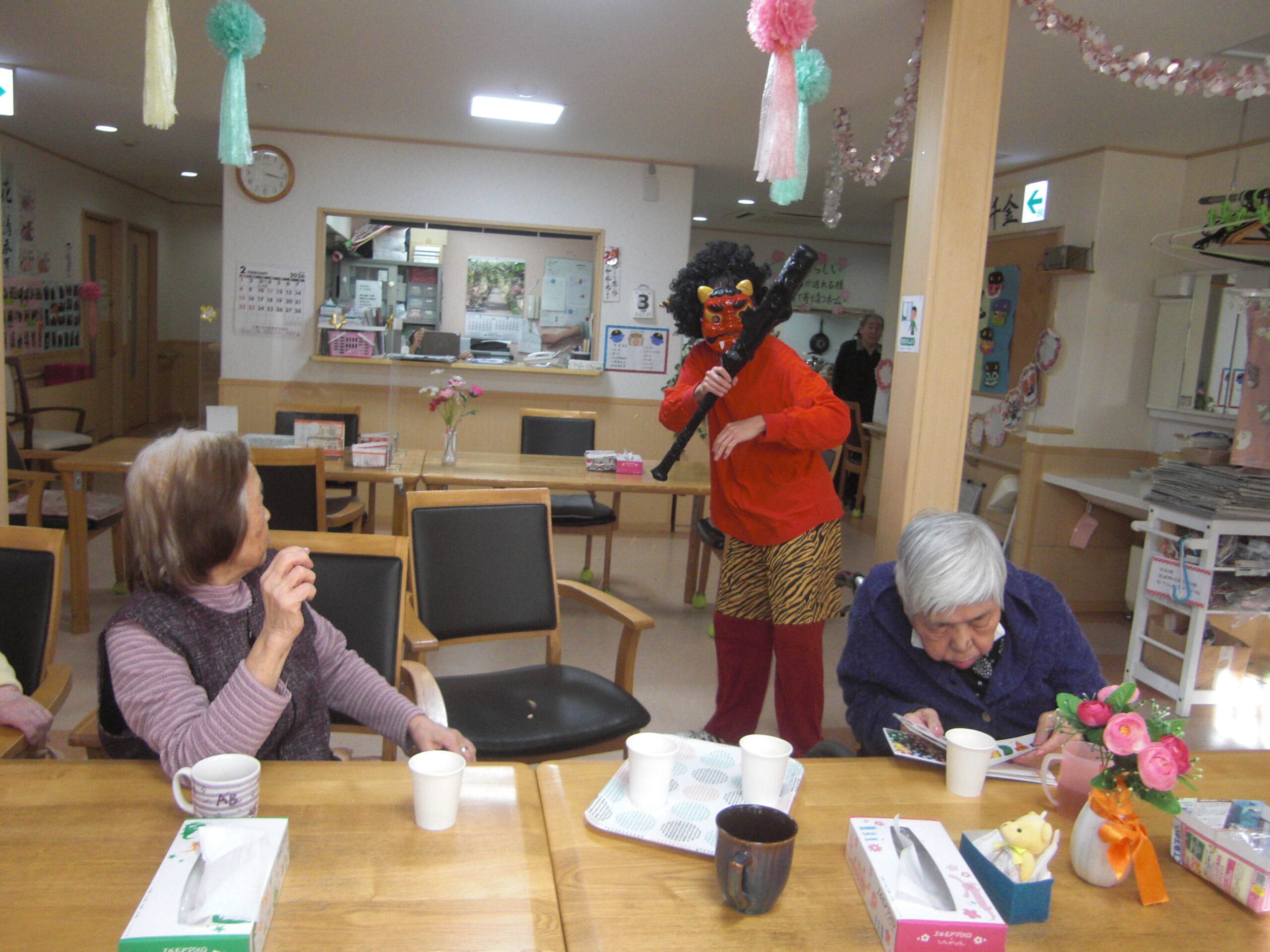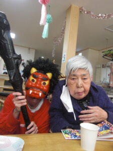 こもれびの郷マウントバード通信 鬼は外~福は内~(こもれびの郷) 2/3のおやつの最中、鬼がやってきました。 鬼に向かって本気で豆をまく利用者様ではありましたが、最後は笑顔で鬼とツーショット写真を撮っていました。 今年もこもれびの郷には福がやってくることでしょう。 鬼は最後に来年も絶対来るからなとセリフを残しどこかに去っていったようです。