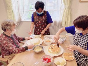 さくらの家マウントバード通信 敬老会&お誕生日&親睦会!! 敬老のお祝いと お誕生日会と 1,2階の親睦会を ごちゃ混ぜでおこないました! 今回は、タコパ☆ 焼きたてのタコ焼きは 美味しい美味しい!と、 皆さまモリモリ召し上がっていました♪ おやつには、フルーツ盛りだくさんのデコケーキ♪ 皆さん良い笑顔 (^o^)丿 お腹いっぱいな一日となりました
